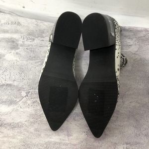 Pointed toe. Elastic insets. Adhesive residue on bottom.