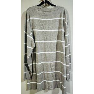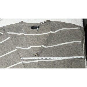 This Bloomchic Heather Gray Cardigan, size 20, features a striped pattern and button-up design. Made of soft, stretchy Acrylic+3 material, it has a 3/4 sleeve length and a long fit for extra comfort.