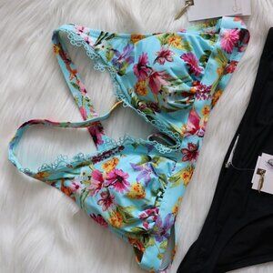 NEW Blue Black Floral Print Eden Print Lace Bikini Swim Set Size Small
