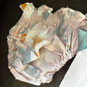 Baby blue floral set with smocked top and matching bloomers. Features adjustable straps and a playful design. There is NO stains (the pictures make it look stained but it’s actually the pale brown leaves in the design)