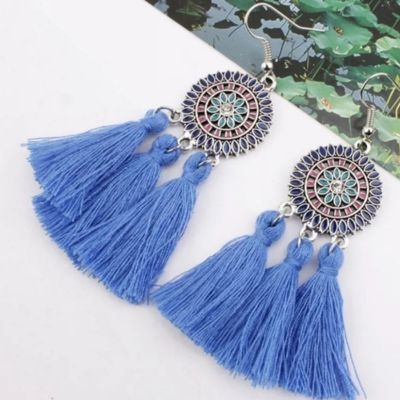 NEW Blue Western Tribal Tassel Dangling Gift Earrings Preppy Clueless(#1,046)