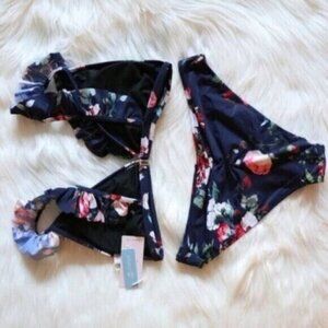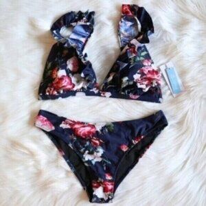 NEW Blue Ruffled Floral V Neck Bohemian Boho Bikini Swim Set Size Large