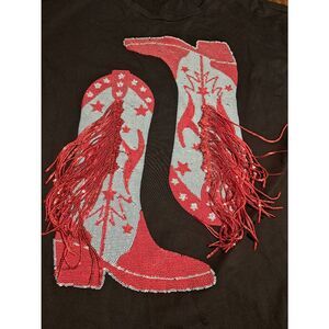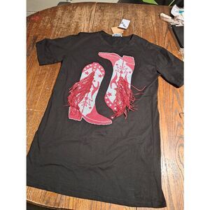 Beautiful new with tags Blue b. Collection women's size small T-shirt mini dress featuring sequin and fringe embellishments. Perfect for rodeo events, concerts, or special occasions — eye-catching and fun to wear. This short-sleeve pullover dress has a round neckline and showcases a striking cowboy boot design in gray and red with playful fringe and sequin details. Made of 100% cotton for comfort and style. Fits women’s size 3–5 (bust 33–35”, waist 25–26”, hips 35–36”) with a back center length of approximately 32.5 inches. Color tone may vary slightly due to lighting conditions.