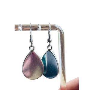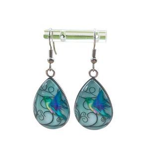 Crafted from hypoallergenic stainless steel, these earrings offer a beautiful teal and mixed blue design, featuring intricate hummingbird motif.