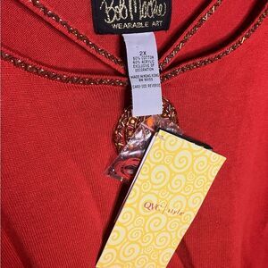 NWT Bob Mackie Wearable Art to Wear Beaded Appliqué Cutout Neck Sweater Artsy in Burnt Orange, size 2X.