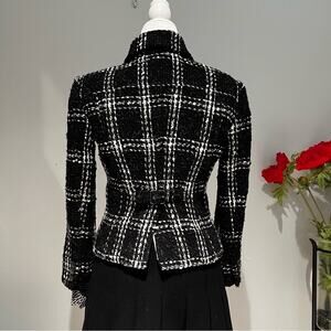 New without tags Stunning Wool Bouclé Tweed Windowpane Plaid Zipper and Button Up Career Suit Blazer Jacket by Body by Victoria, Victoria’s Secret. Gorgeous and Vivid Black, White and Grey Plaid Boucle. Thick Silver Zipper and Button Up Front with Snap at Neck. Adjustable Buckle at Back Waist. Semi- Fitted. Long Sleeves. Lined with Blue and White Pinstriped Fabric. Spread Collar. Warm and Comfy Cozy. Perfect for the Cooler Fall Weather. Sz 2. RARE. HTF.
