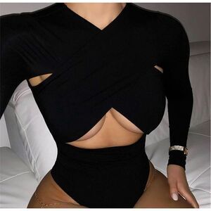 Feature: Long sleeves, Cut out front, Crisscross, High waist, Snap button, Solid color, fabric has some stretch, bodycon slim fit one piece bodysuit top.