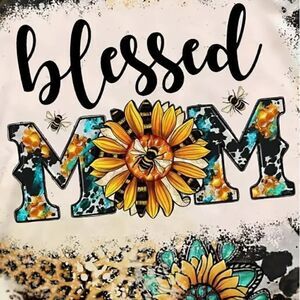 NEW! Cute and Trendy Boho BLESSED MOM Short Sleeve T Shir with Sunflowers, bees, and a leopard print mix! This is available in a women's size Large (12) or X-Large (14)