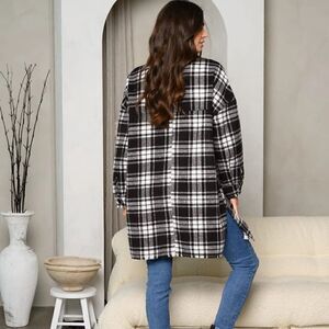 NEW! Boho Black White Plaid Long Length Flannel Shacket Jacket Button Front Warm