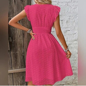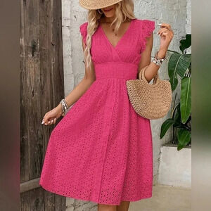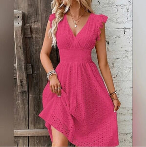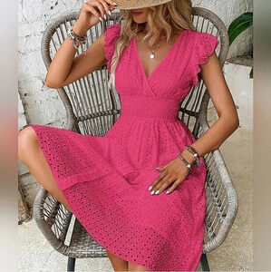 NEW Boho Embroidered Eyelet Lace Ruffle Dress Hot Pink Barbie