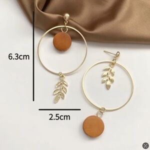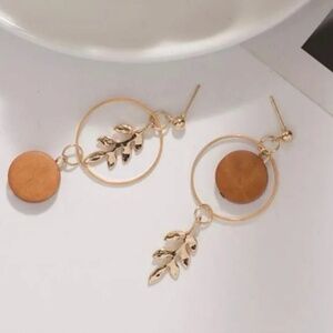 NEW!! Boho Festival Gold Leaf Drop Dangle Earrings Wooden Circle Jewelry