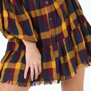 NEW! Boho Multi Colored Plaid Fringe Bottom Button Front Mini Dress Long Sleeve