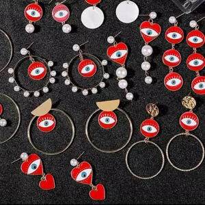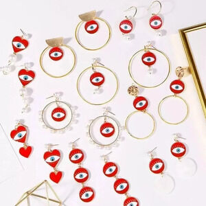 These earrings feature a gold coin stud and a 3-tier design. Adorned with a gorgeous red enamel evil eye and a round hoop at the bottom. Gold posts and details.