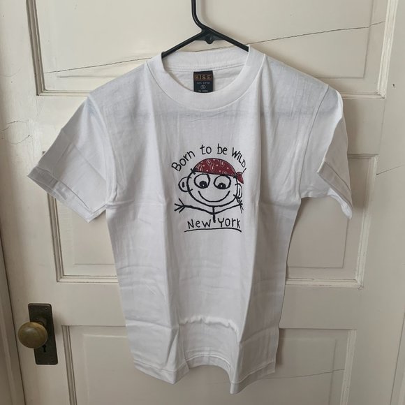 This white T-shirt is perfect for kids who want to show off their love for New York City. The shirt features a solid pattern and short sleeves with a classic crew neck, making it easy to wear. It is made from 100% cotton fabric, making it both comfortable and durable. The shirt is vintage and features the phrase "Born To Be Wild" along with a New York City theme. The shirt is from the brand H.I.&.E , it is a pullover style and is available in Childs XL size. This T-shirt is a great souvenir for kids who have visited or love New York City!