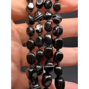 Genuine Botswana agate stone beads knotted on black cord at a 44 inch length with a 925 sterling silver clasp. Anthology brand tag charm for Nordstrom.