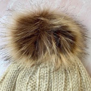 Cable knit in a soft ivory/oatmeal color. Faux fur pompom in light and dark brown, black. Cozy and neutral accessory.