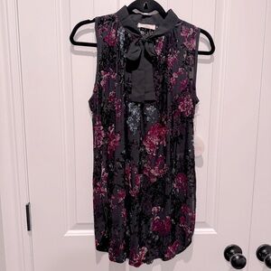 Chic Boutique floral sleeveless tunic blouse featuring a bow tie detail. Perfect for adding a touch of elegance to any outfit. Sheer. Slits on sides. Elegant velvet floral and Glitter accents through out.
