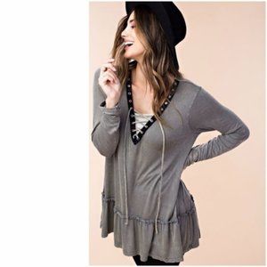 This cozy oversized top by Kori has a ruffled peplum hem and twill lace up neckline. 95% rayon, 5% spandex. Brand new item from my boutique collection.