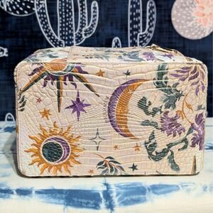 Celestial charm awaits with this Brahmin train case! Picture this: an exquisite vanity bag adorned with a whimsical celestial design – suns, moons, stars, and delicate florals dance across the surface, creating a captivating, dreamy vibe. The bag features a structured silhouette and a top handle, making it easy to carry and display. Open the secure zip-around closure to reveal a spacious interior, ready to house all your beauty essentials. Imagine this stunning train case gracing your vanity, adding a touch of magic to your daily routine, or accompanying you on a weekend getaway, keeping your makeup safe and stylishly organized. It would also be perfect for storing art supplies or crafting essentials.