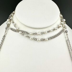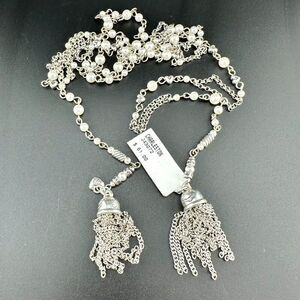 Brand new with tag Brighton Charleston Tassel Necklace, a retired design. 40" beaded chain, adorned with faux pearls, adds sophistication, perfect for any Brighton jewelry enthusiast. Wear it untied or in a knot. Two 1.5" silver tassels with intricate floral motifs and delicate silver heart details enhance the vintage allure.