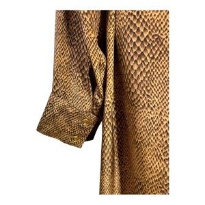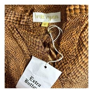 NEW Britt Ryan black and golden brown snakeskin print short knee length dress, collared with long sleeves and metallic gold buttons below v neck line. 100% silk with adjustable cloth tie waist line and single gold button closure at each sleeve hem.
