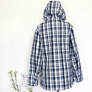 Description: This is a genuine Brooks Brothers Red Fleece Rain Jacket. No rips, tears, marks, stains, flaws or defects. NO damages. The jacket features plaid print design, front zip and snap button closure, attached hood with adjustable drawcord, long sleeves, side pockets with zip closure, polyester fabric, fully lined, machine washable. Retail $150