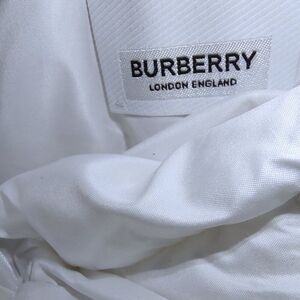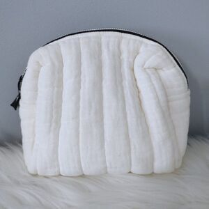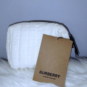 Cute white toiletry bag / pouch / cosmetic bag from Burberry's baby collection. Fabric is like muslin, with nylon lining. The type of bag you'd pop into a diaper bag. Would be a great baby shower gift esp stuffed with diaper cream and baby powder!