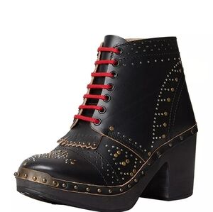 Step out in style with these chic studded black ankle boots. Featuring bold red laces, these boots add a touch of edge to any outfit. Perfect for a night out or a casual day look.