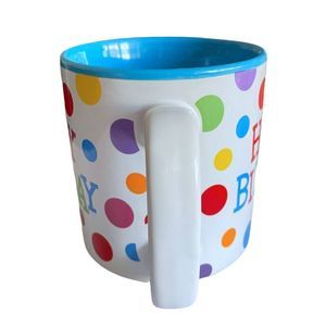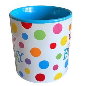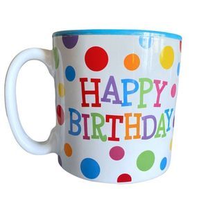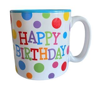New without box, no flaws A riot of brightly colored polka dots with a "Happy Birthday" message, even the inside is colored a bright blue! Standard mug size holds 13 oz of your favorite liquid I ship same or next business day! P0.99 birthday, happy birthday