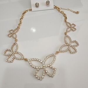 IN LOVE with this gold tone and crystal embellished butterfly necklace. It can be dressed with casual with any t-shirt or formal with a dress. Such a versatile piece. Y2K 90s vibes all over. Comes with small stud crystal earrings. Get yours before its gone!