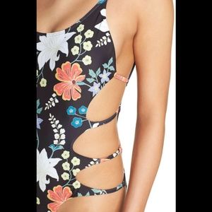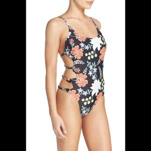 Make an absolute splash at the beach in this one-piece swimsuit featuring a bold floral motif, strappy sides and a cheeky fit.