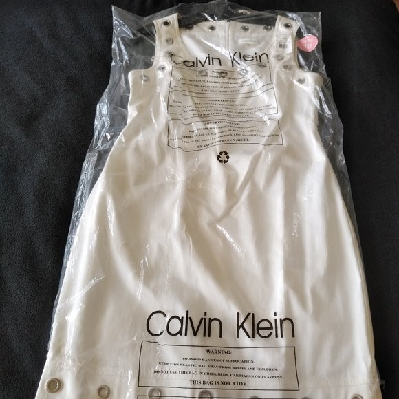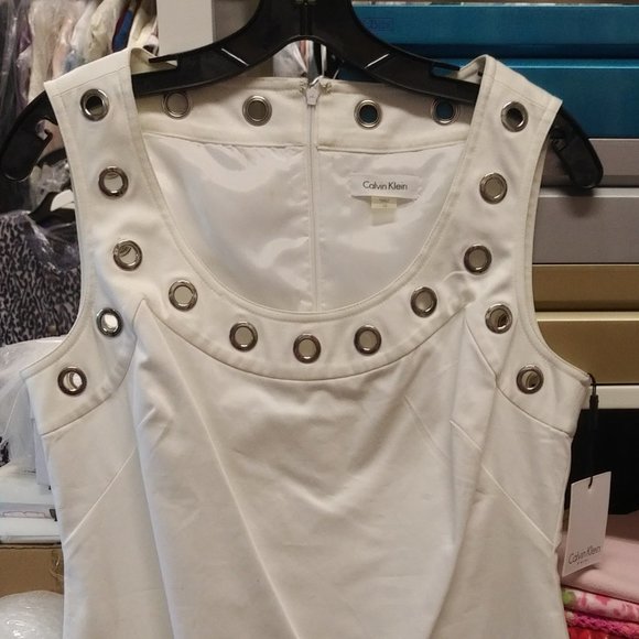 BRAND NEW WOMEN'S CALVIN KLEIN WHITE COTTON SLEEVELESS DRESS WITH SILVER GROMMETS AROUND THE NECK AND HEM IN SIZE 10 FOR SALE FOR $110 - Brand New Women's Calvin Klein White Cotton Sleeveless Dress with Silver Grommets around the Neck and Hem in a Size 10 is slightly fitted at the waist. It is a nice weight fabric comprised of 98% Cotton and 2% Spandex with a Lining of 100% Polyester.