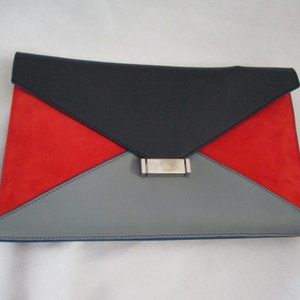 stunning BRAND NEW W TAG / NWT in original dustbag and box, authentic / genuine CELINE PARIS, gorgeous DIAMOND CLUTCH flap bag with in suede and leather in shades of navy blue, red, and grey/ gray. Monogram letters "CM" faintly under flap. Measures approximately 6.75 inches tall, 11 inches long, 1.5" deep, with magnetic secure latch and closure. Interior zip section, serial number on tab in back section.