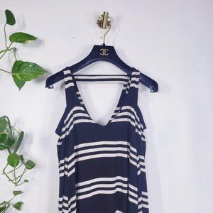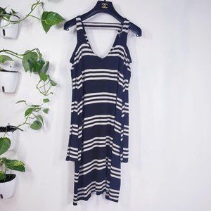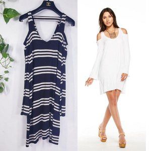 New Chaser Black White Striped Cool Jersey Double V Cold Shoulder Mini Dress features: Cold Shoulder Long Billowy Sleeves Double V with Back Cut out Trapeze, Swing Silhouette