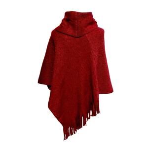 This CHICOS Women's Wild Poppy Red Cozy Stripe Cowl Neck Poncho Sweater is the perfect statement piece for the winter season. Made from a blend of polyester, acrylic, and other materials, this relaxed fit one size sweater features a cowl neck and fringe accents for added flair. The festive red color, shimmer fabric, and machine washable care make it ideal for various occasions from casual outings to parties. Add a touch of bohemian style to your wardrobe with this versatile and stylish poncho sweater.