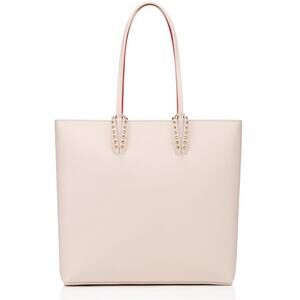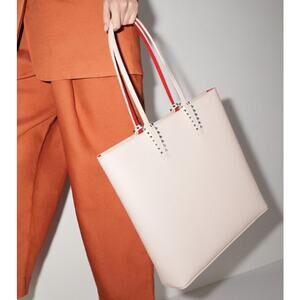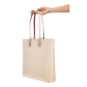 This Christian Louboutin tote is crafted in textured Leche calf leather with spikes around the bottom of the handles and an iconic red logo base.