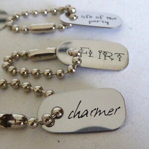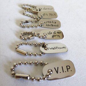 New, never used, set of 6, silver metal, cocktail hangers / markers. Each has as a different personality / character trait etched into it. Includes: Flirt, Charmer, Life of the Party, Wallflower, V.I.P. and Party Animal. (See photos for details.) I am the original owner. It has been in climate controlled storage since purchased. Comes from a pet and smoke free home.