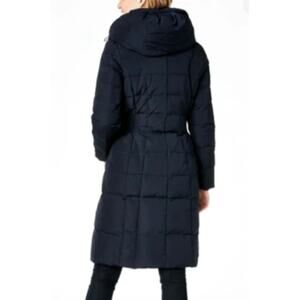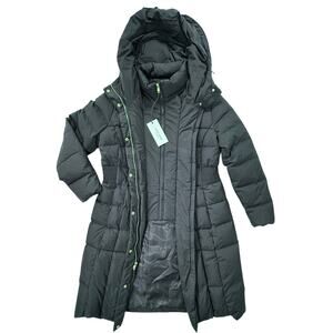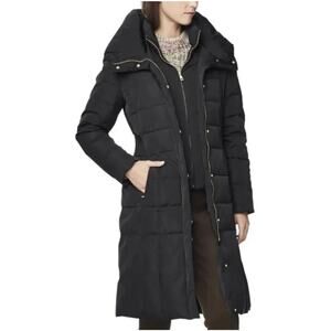 NEW COLE HAAN Long Down Coat Hooded Inset Vest Box Quilt Parka Black