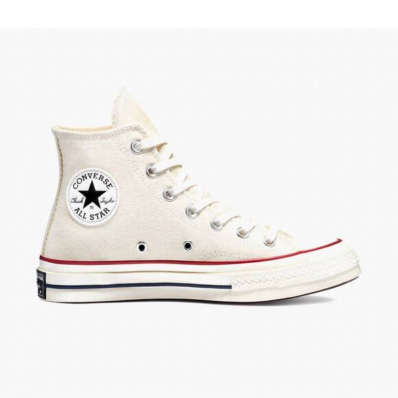 - Description: Step into style with the Men's Chuck 70's Vintage Canvas Sneakers by Converse, perfect for your next dinner party or streetwear outing. Crafted from a premium canvas in a seasonal cream hue, these high-tops feature a round toe and flat heel for comfort. The design is finished with a winged tongue stitching, a vintage star ankle patch, and a license plate, all set on an archive-inspired, glossy egret midsole. Enjoy the added comfort of an Ortholite insole, making them ideal for summer celebrations like the 4th of July.