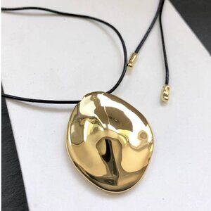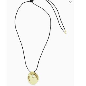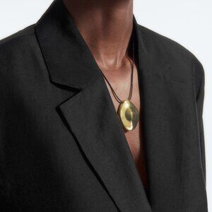 Celestial shapes inform the COS jewellery collection this season. Suspended from a slender leather strap, this pendant necklace is crafted from gold-plated recycled brass and has a mottled, organic silhouette. It will look particularly striking layered with the oversized version.