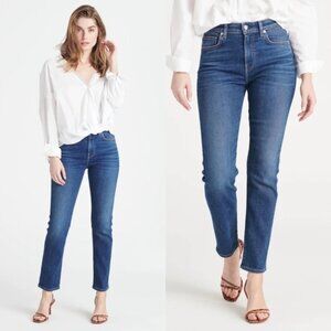 you can't go wrong with a pair of high-rise straight leg jeans that's been faded to perfection. the BFF in 'Sincere' is sure to become an instant favorite. cut to skim right above the ankle, this five-pocket style is crafted from incredibly soft Italian stretch denim in a dark indigo wash that comes to you already broken in, creating the impression that you've been wearing it for years