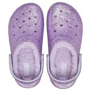 Everybody loves the comfort of the Crocs Classic Clog — and our toasty fuzz lined version keeps the feeling going in all seasons. The fuzzy lining and back strap help keep toes and heels toasty warm, indoors or out, while Croslite™ foam construction keeps them light and easy to wear. And this version features a fun all-over glitter treatment. Enjoy cozy style, comfort and sparkle.