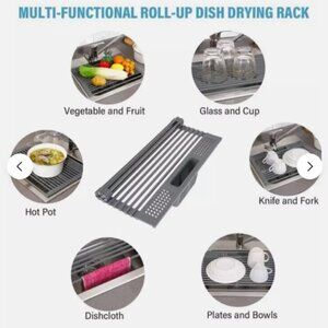 【Multi-purpose】The roll up dish drying rack for kitchen counter is great for air-drying kitchenware like dishes, bowls, pans, cups, plates, cookware and even fruits and vegetables. Works great and keeps the kitchen sink area looking neat.