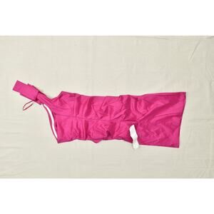 This is a new-with-tags vintage Cache women's dress in a vibrant hot pink color, size 6. The dress has a strapless, bodycon style with extensive ruching throughout the bodice and skirt, creating a textured, flattering silhouette. It features a concealed side zipper closure and a bow detail on the left side of the waist. The material appears to be a lightweight silk or polyester blend with a slight sheen, giving it a formal or cocktail look. The tag indicates it was made in the USA and originally retailed for $168. The measurements show the dress has an armpit to armpit size of approximately 14 inches and a total length of 27.5 inches. Perfect for a special occasion, party, or evening event, this dress embodies classic Y2K or 2000s style. Due to its vintage nature and new-with-tags condition, it's a unique find for collectors or anyone seeking a standout piece.