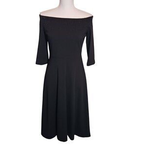 Calvin Klein Off-The-Shoulder High-Low A-Line Midi Dress in Black, Size 4 is the definition of modern minimalism with its form-flattering silhouette and alluring off-the-shoulder design. Modest beaded detailing adds an extra touch of elegance. Perfect for any semi-formal event, special occasion or this season's holiday parties!