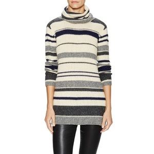 New, never worn turtle neck from Calypso. Made of a very soft woven wool-blend (52% wool, 35% camel hair, 13% polyamide). Super soft, not itchy. Cream/off white, grey, charcoal and navy striped. Approximately 27 inches from the shoulder to the hem, hits about upper thigh on me. Size XS - I normally wear a 2/4 and it fits well, not tight. There's a small slit on each side that starts 8 inches from the hem. No tags.