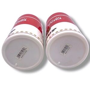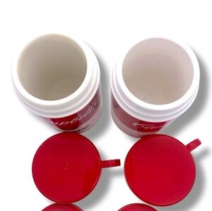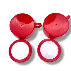 Insulated travel mug set in red and white. Includes a mug, lid, and container.