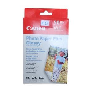 Canon Photo Paper Plus Glossy, 4" x 6" size, 50 sheets. Premium-quality glossy finish for vibrant color and sharp detail. 92 brightness, 270 gsm weight. Brand new in box; box may show minor storage wear.