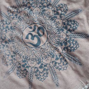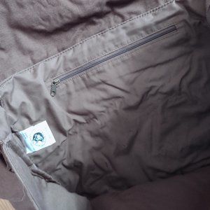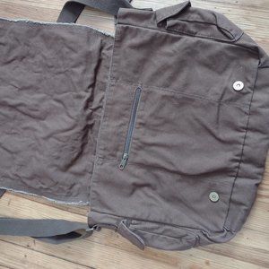 Brown with black design printed on front flap. Snap pockets on each side, plus zipper pockets inside. Very large space inside. Adjustable strap. Brand new, never used (wrinkled from storage). 100% Cotton. Made by Authentic Pigment.
