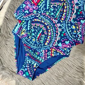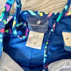 NEW Caribbean Joe Bandeau Ruffle Blue Aztec Women’s One Piece Swimsuit Sz 8